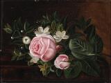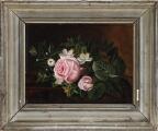 Pink roses on a table. Unsigned. Oil on panel. 15.5×21 cm.