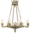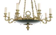 A French Empire style brass chandelier with green painted bowl and eigjt light arms, cast with floral garlands and ornamentation. Electrified with two internal light sources. 20th century. Diameter 70 cm.