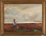 En ung hyrdedreng ved en fjord med sine græssende får. Usigneret. Olie på lærred. 29×39.