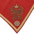 Et skaberak for den engelske hestgarde ca. 180×130 i rødt klæde med guldborter dekoreret med krone over “battle honors” og hosebånssordens stjerne i hvert hjørne. (1)