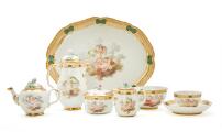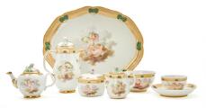 Solitaire dejeuner sæt af porcelæn, glat model, dekoreret af F.C. Camradt i farver og guld med legende putti i skyer efter kobberstik af Jean Daullé efter Francois Bouchers De fire Årstider. Forgyldt netbort med kartoucher udfyldte af grønne skæl; lågknopper modellerede som rosenknopper. Bestående af: kaffekande, tepotte, sukkerskål, flødekande, biscuitskål, kop og underkop samt oval, ligeknækket bakke 34×28 cm. Den Kongelige Porcelainsfabrik ca. 1780–1785 (7)