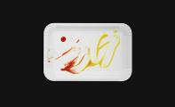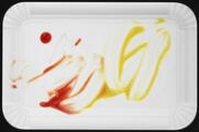 “Selve værket spiller på en umiddelbar genkendelighed i det hyperrealistisk malede motiv af en brugt pølsebakke, men værket giver også associationer til et lærred med abstrakte, ekspressive, penselsstrøg, deraf også den konkrete titel 'Rødt og gult på hvid' som peger på farverne på maleriet. Jeg sender ofte hilsner til andre kunstnere og kunstgenrer i mine værker og i dette tilfælde har jeg haft en kunstner som Roy Lichtenstein og hans Brushstroke værker i mente. Jeg behøver nok ikke at sige, at jeg finder humor som en forløsende indgang til mange af mine værker”. Christoffer Munch Andersen