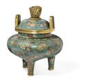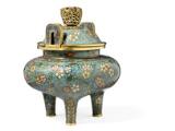 A Chinese gilt bronze and cloisonné enamel tripod censer and cover, a globular form with U-shaped handles decorated with flowers and foliage accompanied by a ruyi border on turquoise ground, the cover with a pierced Buddhist symbol finial. Qianlong 1736–1795. H. 19 cm.