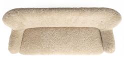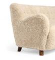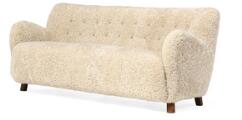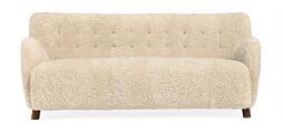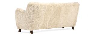 Fritstående tre-pers. sofa med ben af bejdset bøg. Sæde, sider og dybthæftet ryg betrukket med lyst lammeskind. Udført 1930–40'erne. L. 175.