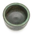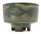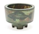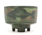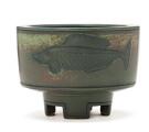 Rund Farsta skål af stentøj med indridset dekor i form af fisk. Dekoreret i grøn-brune farver. Sign. Kåge Farsta samt med studiohånd. H. 11. Diam. 15,2.