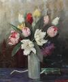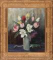 Opstilling med blomster og smykkeskrin. Signeret B. Krilov. Olie på lærred. 60×50 cm.