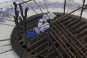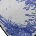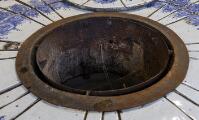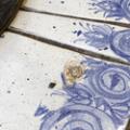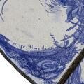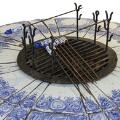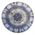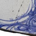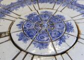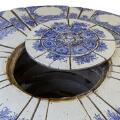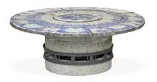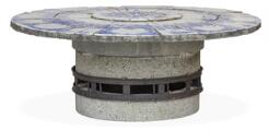 Grill table with stone bottom. Circular top with tiles in blue and white nuances. H. 58 cm. Diam. 153 cm.