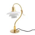 “PH-spørgsmålstegn”. Bordlampe med stel af messing med 2/2-skærme af opalglas. Udført hos Louis Poulsen. H. 42. Diam. 20.
