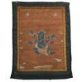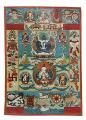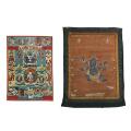 To thangkaer, den ene med firearmet Mahakala med flammemandorla, monteret med stofbort, den anden med Buddha Samantabhadra med konsort og buddhistiske symboler. Farvepigment og gouache, den ene på papir, monteret på lærred. 20. årh. Billedfelt 54×40. Bladstørrelse 57×40. (2)