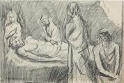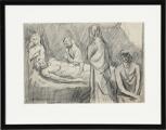 The mourners. Signed v.b-p-28. Probably made during his time at the National Academy of Fine Arts in Oslo (1927–29). Pencil on paper. Visible size 22×32 cm.