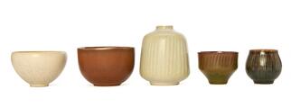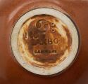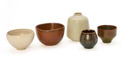 Tre skåle og en vase af stentøj, heraf tre med indridsninger i relief. Dekoreret med rødbrun, grønlig, mørkebrun og lys grå glasur. Alle udført og stemplet hos Saxbo, hhv. Danmark og Denmark, og mærket med modelnumrene hhv. 113, 28, 20, 69 og 19. H. 5,5–10,3. (5)