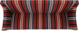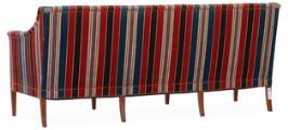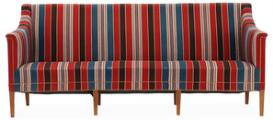 Tre-pers. sofa med ben af mahogni. Sæde, sider og ryg med blåt, rødt og hvidstribet græsk Savakuld samt skindkedder. Model 6092. Formgivet 1940. Udført hos Rud. Rasmussens Snedkerier. L. 202.