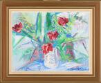 Opstilling med blomster. Signeret A. Naur. Olie på lærred. 50×65 cm.