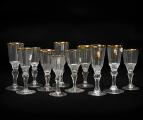 Samling diverse Schlesiske vin- og snapseglas med længdefacetteret let konisk cuppa, forgyldt mundrand, to med kronet R i guld på cuppa, balusterformet, facetslebet stilk på rundt fodstykke. 18. årh. H. 14–17 cm. (11)