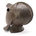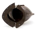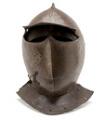 A closed black cuirassier helmet around 1620 for “gemeine” with the bell built in two parts, folding visor, neck collar and feather holder at the back of the crest.