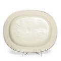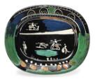 “Corrida verte”, 1949. Stamped Madoura Plein Feu, Empreinte Originale de Picasso. Edition 500. Dish. White earthenware, engobe decoration, engraved with a knife underglaze. Blue, green, red, white, black. 30×36.5 cm.
