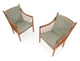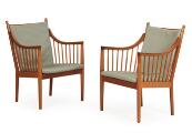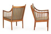 “PP 105”. Et par armstole af mahogni med tremmer i sider og ryg. Løse hynder betrukket med stribet møbelstof Udført hos PP Møbler, med mærkat herfra. (2)