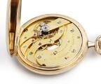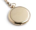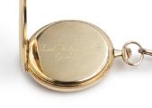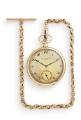 Lommeur af 14 kt. guld. Mekanisk værk med “moustache”-ankergang og kroneoptræk. Gylden skive med Breguet-tal og blånede “observatory”-visere. Støvkapsel af 14k guld. Ø 47 mm. Uret vejer cirka 60,9 gram. Kæde af 14k guld. Denne vejer cirka 18,6 g og måler 31,5 cm. 1915–20.