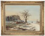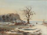 Vinterlandskab med små gårde ved et stort nøgent træ. Sign. F. Södring. 1846. Olie på lærred. 85×112 cm. Damborg-ramme med etiket.