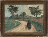 Landskab med en kvinde, der går tur med sin hund. Sign. A.E.M 17. Olie på lærred. 33×46 cm.