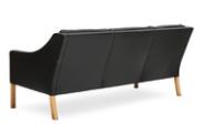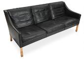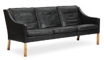 Freestanding three seater sofa with oak legs. Seat, sides and back upholstered with black leather. Model 2209. Designed 1963. Manufactured and marked by Fredericia Stolefabrik, 1985. L. 185 cm.