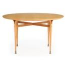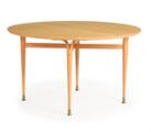 A circular diningtable of laquered ash with brass shoes. Manufactured and marked by Karl Mathsson, Sweden, 1972. Diam. 125. H. 71.