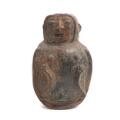Pre-Columbian urn made of fired clay, modelled with a face and limbs, decorated with geometric patterns. Quimbaya culture. H. 23 cm.