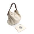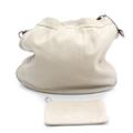 “Hobo” bag of beige leather with silver tone hardware, adjustable handle, dark brown leather trimmings, one compartment with zipped pocket and beige lining. H. 40. W. 46. D. 9 cm. A small clutch of offwhite leather with silver tone hardware, one compartment with beige lining. H. 15. B. 22. D. 0.5 cm. (2)