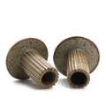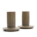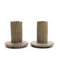 Et par lysestager af stentøj, lystyller med vertikale riller. Dekoreret med beige glasur med mørke elementer. Sign. monogram, 133. H. 9,2. Lystyllers indv. diam. 2,5. (2)