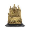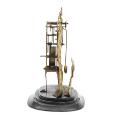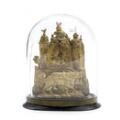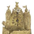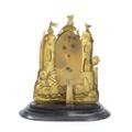 A Zappler pressed gilt metal figural miniature timepiece with castle and a boy riding on a dog. Gilt dial with Roman numerals. Enclosed fitted glass dome with wooden base. Austria. Second half 19th century. H. incl. the dome 11.5 cm.