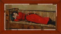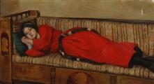 Portrait of Inger Margrethe Rasmussen (1882–1972) in a red dress reclining on a couch. Unsigned. Oil on canvas. 34×63 cm.