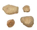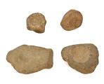 Fire små sten med skåltegn. En sekskantet med 5 skåltegn ca. 4×5 cm, en kegleformet med enkelt skåltegn i basis ca. 6,5 cm. i diameter, en nærmest trekantet ca. 8×9×11 cm. med enkelt skåltegn samt en uregelmæsseg ca. 13×8 cm. med enkelt skåltegn. (4)