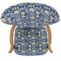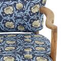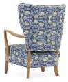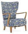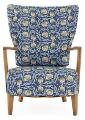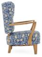 Lænestol af eg. Sæde og ryg betrukket med blomstret stof.