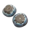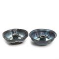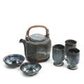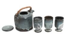 Tekande med hank af bambus, et par lysestager samt tre bægre på fod af hårdtbrændt lertøj, dekoreret med blågrå glasur. Stemplet monogram. Kande H. ekskl. hank 12. Bægre H. ca. 9–9,5. (6)