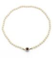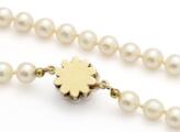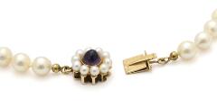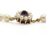 A pearl necklace set with numerous pearls and an amethyst clasp set with a cabochon amethyst encircled by numerous cultured pearls, mounted in 14k gold. Clasp diam. 12 mm. Pearl diam. app. 2–5 mm. L. 48 cm.