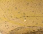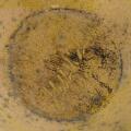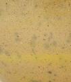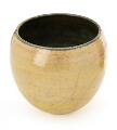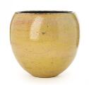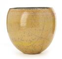 Vase af rakubrændt keramik, dekoreret med okkerfarvet glasur med rødlige elementer og mørk kant. Sign. Helle V. Hutch 2002. Unik. H. 21. Diam. 22.