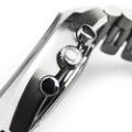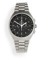A gentleman's wristwatch of steel. Model Speedmaster Mark II, ref. 145.014. Mechanical chronograph movement with manual winding, calibre 861. Black dial with exchanged white hands and tritium hour markers. Exchanged chronograph pushers and winding crown. New Omega bracelet of steel, ref. 1162/173. Circumference app. 20 cm. Case diameter app. 42 mm. Circa 1970.