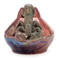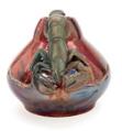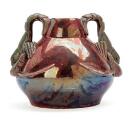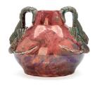 “Hummervasen”. Rund krukke af lertøj modelleret med to hanke i form af hummere i relief. Dekoreret med rød lustreglasur. Sign. HAK. Udført hos Kähler. H. 19. B. 22.