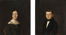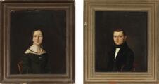 2 portraits of the couple Jens Ring Petersen (1815–1872) head of the bank, Sparekassen for Skive og Omegn and his wife Dorthea Christiane Ring Petersen (1823–1883). The latter signed J. J. Holm, both dated 1839. Oil on paper laid on cardboard. Visible size: the former ca. 14,5×12,5 cm. The latter ca. 15×13,5 cm. (2).