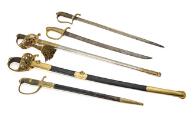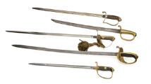 En samling sabler bestående af en dansk sabel for officerer og underofficerer M/1904 med forniklet ca. 50 cm. lang enægget klinge mærket C. L. SEIFERT i læderskede med to beslag, en dansk underofficerssabel M/1910 af samme med ca. 60,5 cm. lang klinge, en fransk sabre briquet uden afdelingsstempling med rustmærket ca. 56 cm. lang klinge, en messinngfæstet svensk officerssabel omkring 1870 af såkaldt “tillåten model” af Herazcek med ca. 80,5 cm. lang enægget stangrygsklinge med yelman mærket J. S. HERAZCEK & SØN KIØBENHAVN i skriftbånd på brystets ene side og EISENHAUER i samme på den anden side i læderskede med tre beslag samt en tjekkisk officerssabel efter M/1924 med ca. 72 cm. lang forniklet klinge i forniklet jernskede med to messingbeslag. (5)