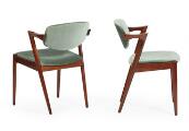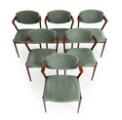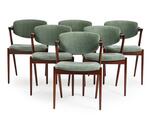 Et sæt på seks armstole med stel af palisander. Sæde og vipperyg betrukket med grønt velour. Model 42. Udført hos Schou Andersen. (6)