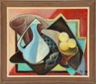 Opstilling med kande og frugt. Sign. Muff. Olie på lærred. 52×60.