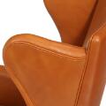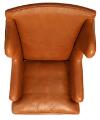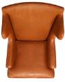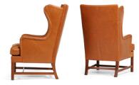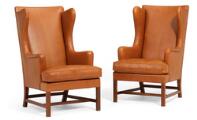 Et par øreklapstole med stel af mahogni. Betrukket med brunt skind. Model 6212. Formgivet 1941. Udført ca. 1970'erne hos Rud. Rasmussens Snedkerier. (2)
