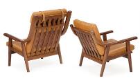 “GE 530”. Et par lænestole med en tilhørende skammel, stel af mørkbejdsetbejdset eg, løse hynder i sæde og ryg betrukket med cognacfarvet skind. Designet 1970. Udført og stemplet hos Getama, Gedsted. (3)