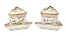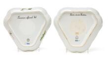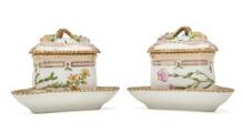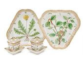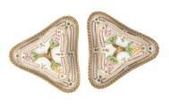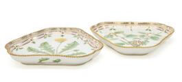 “Perlestellet” two three-sided dishes and two pairs of three-sided cream cups of porcelain, decorated in colors and gold with flowers in the Flora Danica style. Royal Copenhagen. (4)