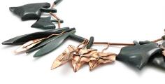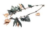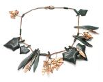 Halssmykke af kobber og bakelit med talrige vedhæng i form af blade. Designet for Monies. 1988. L. 66,5 cm.