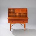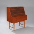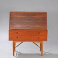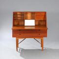 Teak secretary with front and handles of rosewood. Front with two drawers and flip-down front, inside with storage space, drawers and mirror. Manufcatured by Fredericia Stolefabrik. H. 115 cm. W. 100 cm. D. 50 cm.