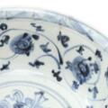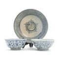 Kinesisk fad og to skåle af porcelæn, dekoreret i blå. Kitchenware. Ming 1368–1644. H. 5,5–7. Diam. 14,5–25. (3)