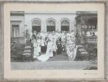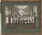 Bryllupsfoto anno 22. oktober 1908 ved vielsen mellem Prinsesse Alexandra Victoria af Slesvig-Holsten-Sønderborg-Glücksborg og Prins August Wilhelm af Tyskland. Blandt de mange personer står brudeparret midt for og nr. to til højre herfor Kejser Wilhelm II af Tyskland. Monteret på karton. Bladstørrelse ca. 26×38 cm. Rammemål ca. 36×47 cm.