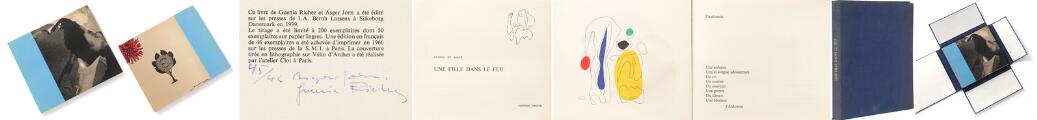 “Une fille dans le feu”. Paris: presses de S.M.I. 1966. 8vo. 36 p. Illustr. with orig. lino cuts by Jorn. One of only 46 numbered copies, signed by both Asger Jorn and Guenia Richez. Publisher's lithographed paper binding.